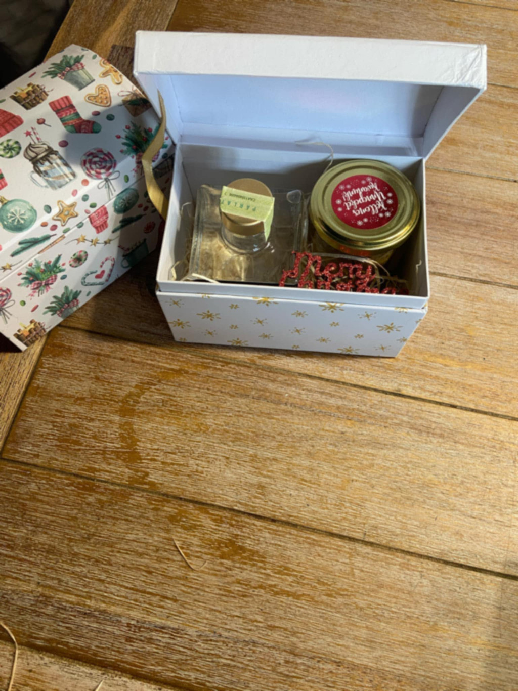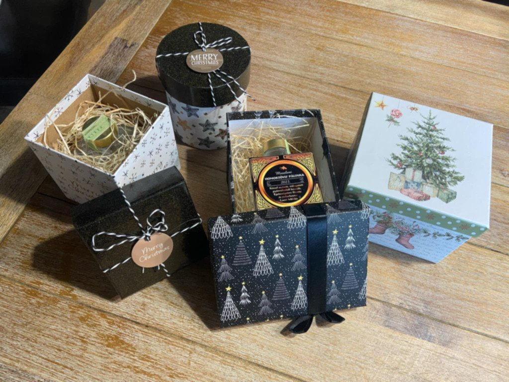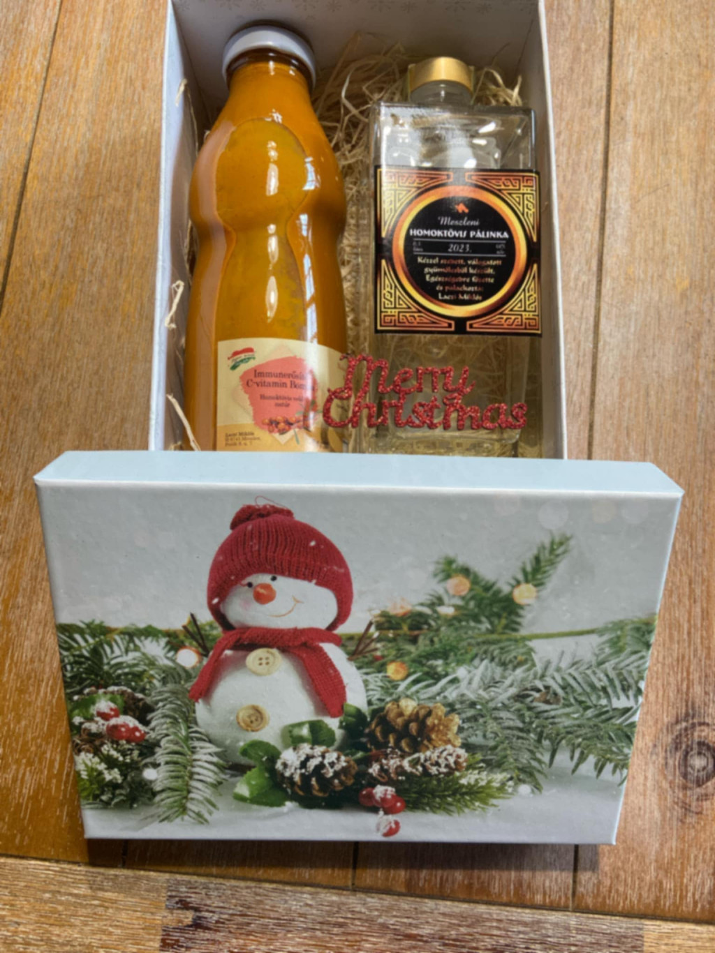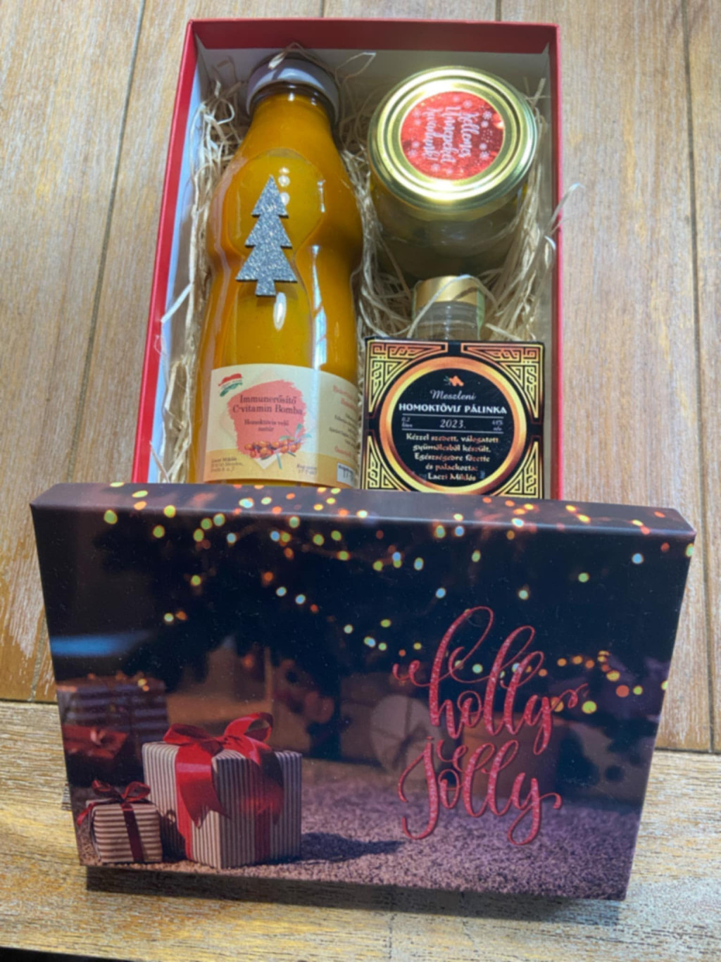 Karácsonyi ajándék csomag díszdobozban Az ajándék csomag tartalma: 200 ml homoktövis pálinka és egy üveg bodza virág lekvár . A készlet erejéig kapható.