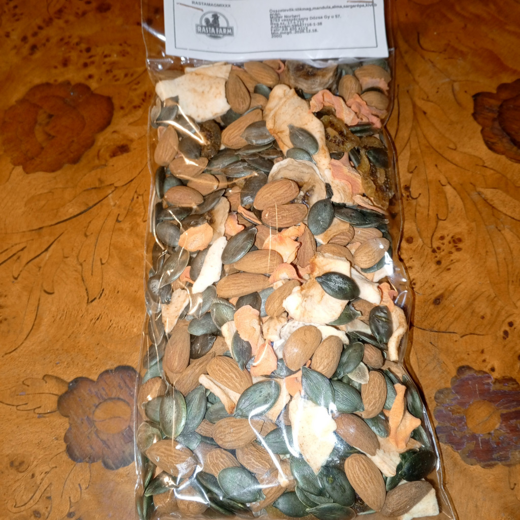 Összetevők: pirított tökmag, mandula, aszalt koktél paradicsom, aszalt paprika,aszalt lilahagyma, adalèkmentes só. 200r/csomag.