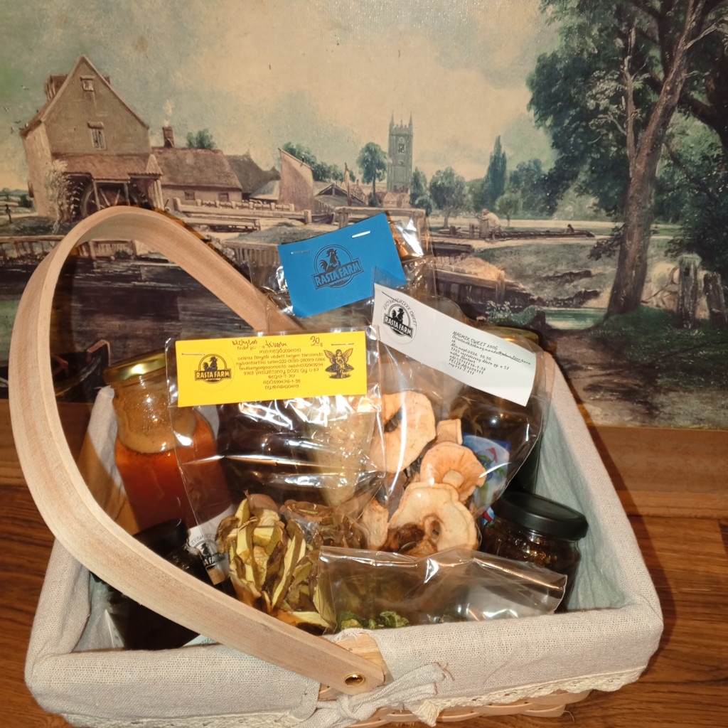 Cuki füles kosárban. Tartalma 3*300 ml szörp 3 különböző , 0,5 kg vegeta . 106 ml sült fokhagyma vagy Yalapista, 2*212 ml lekvár különböző, 20 g molyhos tinoru csak kalap szelet.200 g èdes magmix 20 g szárított jalapeno. Kèrèsre egyedit is tudunk összerakni, bár így is az ;)