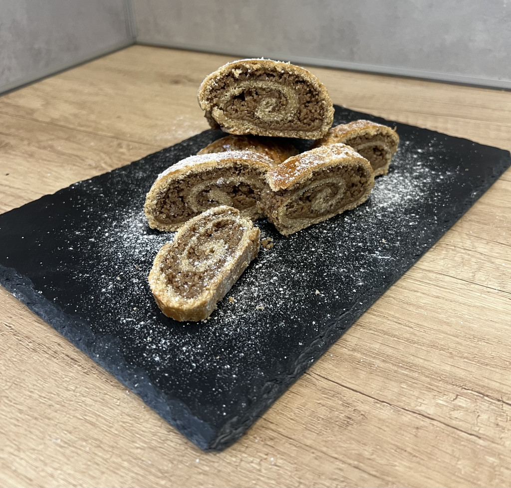 Saját készítésű Glutén mentes lisztkeverékből készítem, ami nem tartalmaz semmiféle adalékanyagot. Összetevők: Barna Rizsliszt, Tápióka keményítő, Cirok liszt, Útifűmaghéj, Vénusz margarin, Porcukor, Víz, Egész Tojás, Élesztő. Töltelék: Darát dió, Kristálycukor, Vaniliás cukor, Fahéj, Szerecsendió, Víz, Citrom, Naracs.