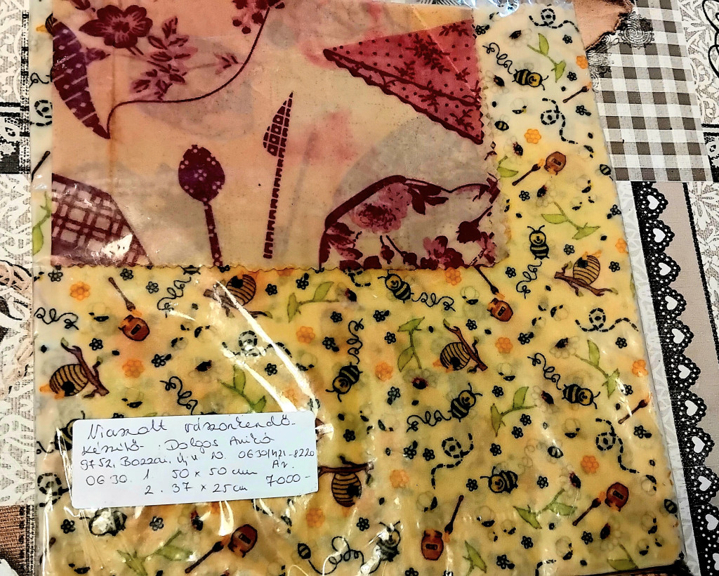 Pamutvászon alappal készítettem a képen látható viaszolt vászonkendőt. Használható élelmiszerek csomagolására, tárolóedények letakarására. Frissentartó viaszoltvászon a viasz antibakteriális tulajdonságának köszönhetően gyümölcsök, zöldségek, sajtok, pékáruk eltarthatóságát időben megnöveli. Kezelési útmutató. Használat után langyos, vagy hideg vízzel puha szivaccsal gyengéden áttörölni, majd vizet lepergetve megszárad. Tűző napra tenni és mosógépben mosni nem szabad. Élettartama kb. 1,5-2 év, utána újra kell viaszolni. Használatnál fontos, hogy minél jobban simuljos a frissen tartani kívánt felülethez. A csomagban található méretek: 50x50 cm 36x31 cm 20x25 cm