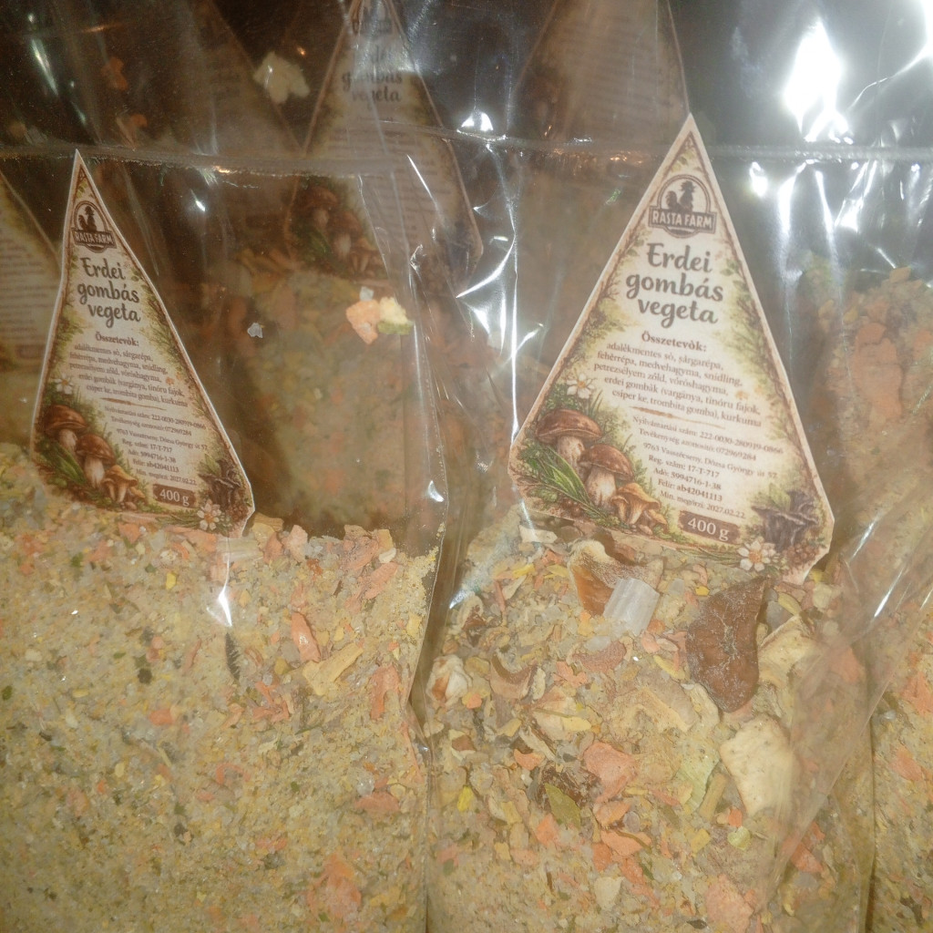 A varázserdőben gyűjtött varázslatos gombákból egy káprázatos ínycsiklandó ételek új dimenzióba emelèsère szolgáló szinte bármihez hozzáadható ètel izesítő keverèk. 400 gr. Összetevők: adalèkmentes só sárgarépa fehèrrèa, medvehagyma,snidling, petrezselyem zöld,vöröshagyma, kurkuma,erdei gombák vargánya,tinoru fajok, csiperke, trombita gomba.
