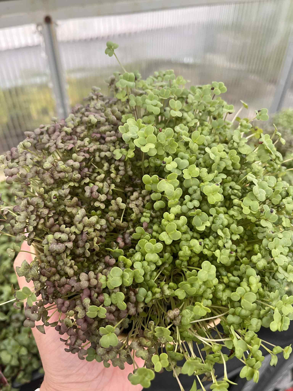 Friss, élő mikrozöld növény. A tégely átmérője 14 cm! Vajrépa: másnéven tarlórépa, ami egy káposztaféle, keresztesvirágú. Íze hasonló a retekéhez, de nem csíp! ez fontos lehet azoknak, akik nem szeretik a markánsabb ízeket. Kissé hasonlíít a borsóra és a spenótra is. Igazán jellegzetes. Tápanyagok: szulforafán, C-vitamin, K-vitamin, B9-vitamin, vas, cink, kálium, kalcium, magnézium, foszfor, rostok és klorofill. Mizuna: enyhén csípős ázsiai mustárféle. Leveleit salátaként fogyasztják. Enyhén mustáros csípősség jellemzi, lágy, jóízű mikrozöldség. A vágottal szembeni előnyök: nem kell hűtőben tárolni, nem kell azonnal elfogyasztani, elég csak annyit szüretelni egy kis ollóval, amit aktuálisan meg szeretnénk enni. 2 naponta egy kis vizet igényel, így akár 1 hétig tárolható a konyhapulton. Fogyasztás előtt frissen szüretelve a legjobb, hőhatás ne érje annak érdekében, hogy ne veszítse el vitamin tartalmát. Mi is az a mikrozöld? A csírához hasonló, ám tovább nevelt növényi hajtások. Már termesztő közegben nőnek, esetemben kókuszrost, kenderrost vagy natúr biotőzeg. Körülbelül 7-14 nap alatt fejlődnek ki szüretelhető növénnyé, ekkor foygasztjuk őket. Koncentráltabban tartalmaznak vitaminokat, ásványi anyagokat és az ízük is markánsabb, mint a csíranövényeké. Roppanósak, frissek, a téli időszak egyik legkedveltebb friss növényei. A mikrozöldeknél csak a leveleket és a szárat fogyasztjuk. Míg a csírák több esetben óvatosságra intenek, a mikrozöldek fogyasztása biztonságos. Nem vízkultúrában fejlődnek, hanem szabad levegőn, földben és napsütésben.