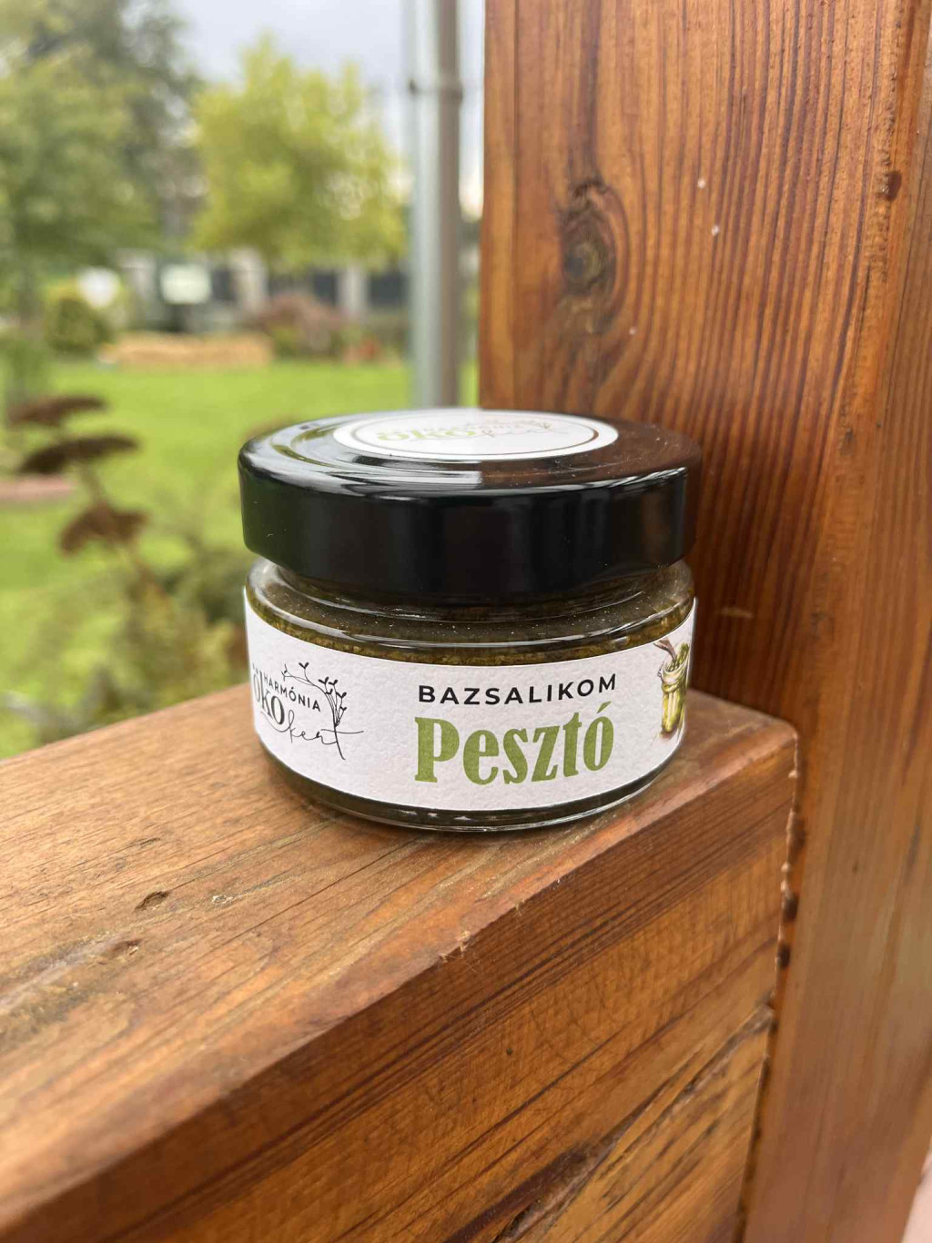 Friss fűszerekből készült pesztó, ami felhasználható tésztaételekhez és zöldségkrémekhez is. A bazsalikom saját, vegyszer-, és műtrágyamentes termesztésű, magról nevelt. Tartósítószermentes! A termék 120 ml-t tartalmaz. Összetevők: bazsalikom, extraszűz olívaolaj, pirított fenyőmag, fokhagyma, himalájai só.