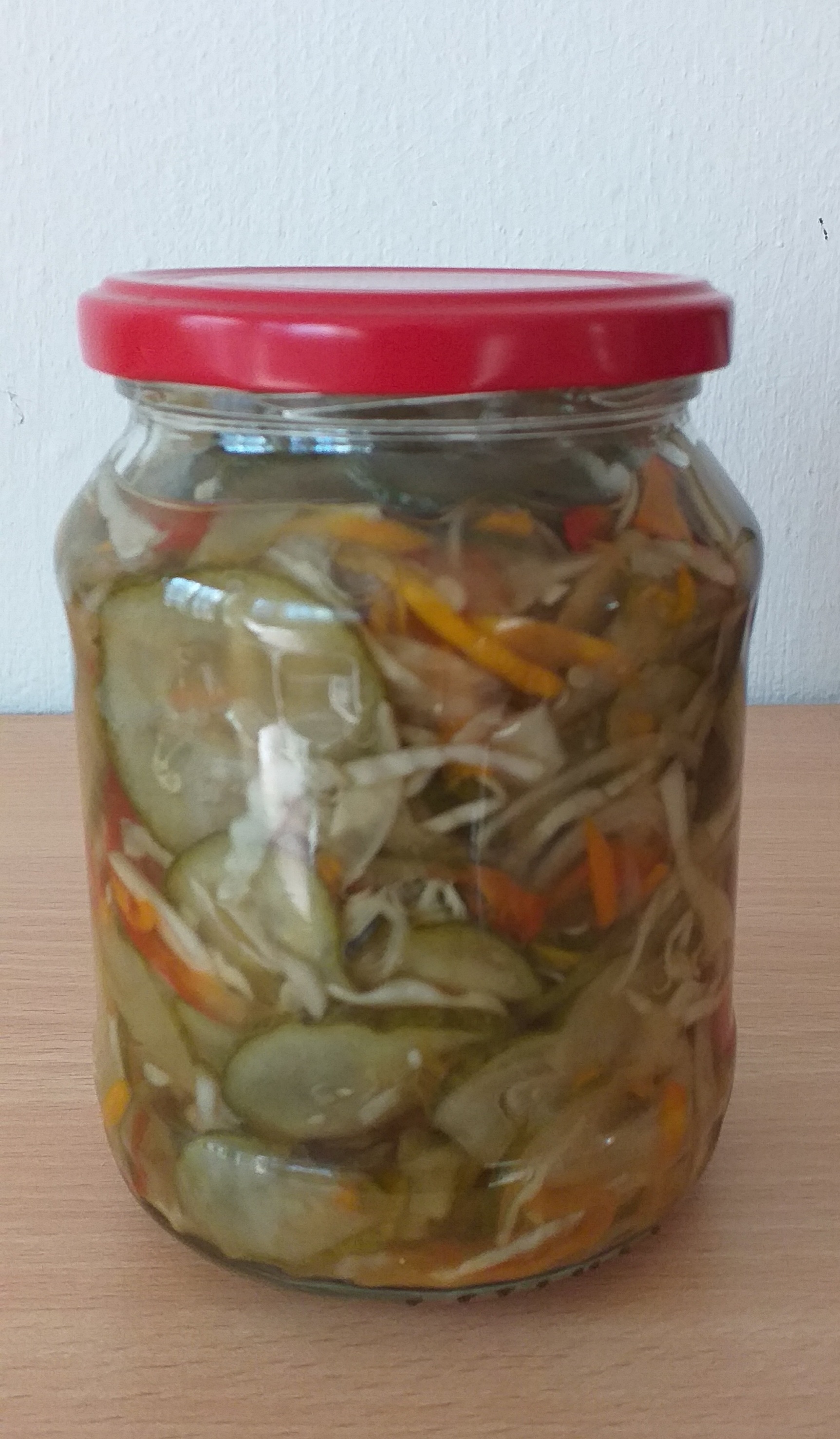 Saját termésü, vegyszermentesen termelt alapanyagokból készült savanyúság..Tartósítószert nem tartalmaz. Összetevők: reszelt uborka, paprika, sárgarépa, vöröshagyma, feketebors, mustármag,ecet,só,cukor Hőkezeléssel tartósítva,ezért felbontás után hütószekrényben kell tárolni! Súlya:650g /400g A kiürült üvegeket visszavárjuk!