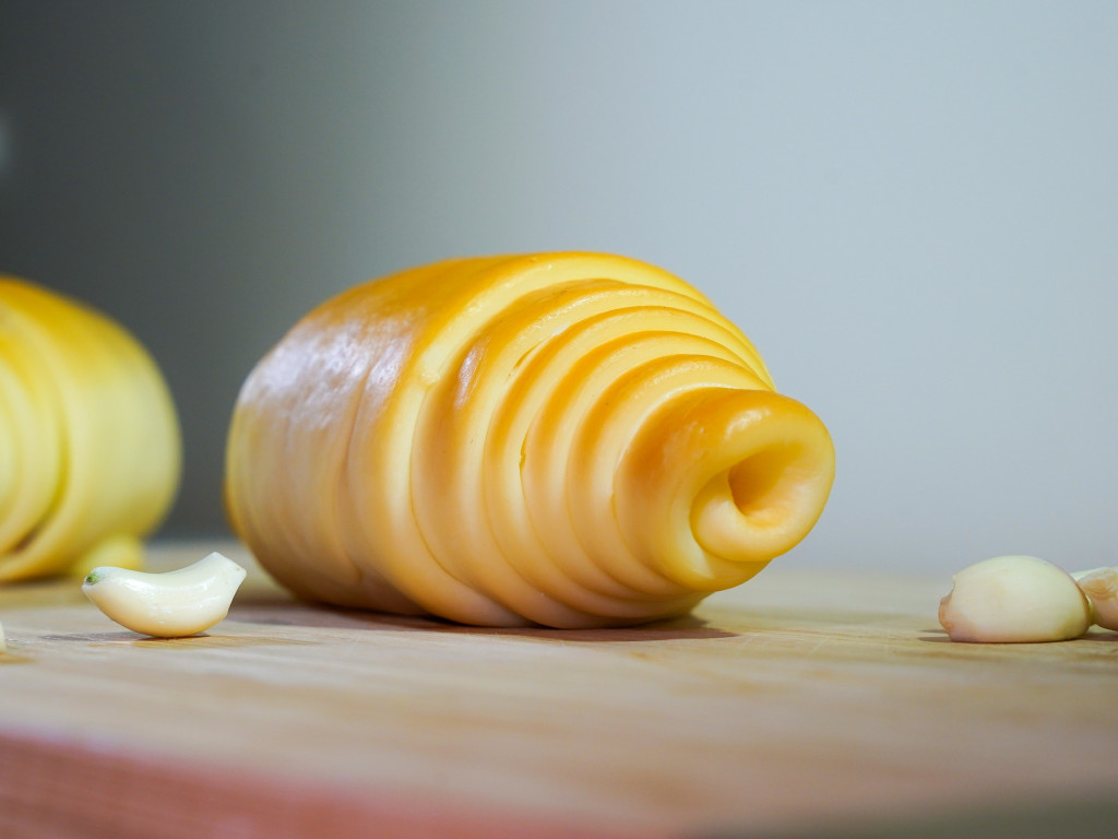 Hevített gyúrt sajt, melyet szalagra nyújtunk, sózunk és csiga vagy croissant formára tekerünk.
